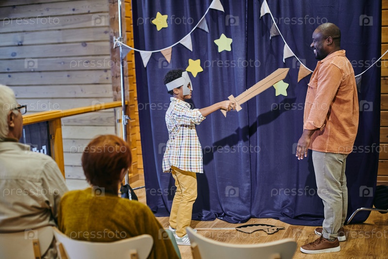 Счастливый мальчик в костюме рыцаря, держащий меч против своего отца