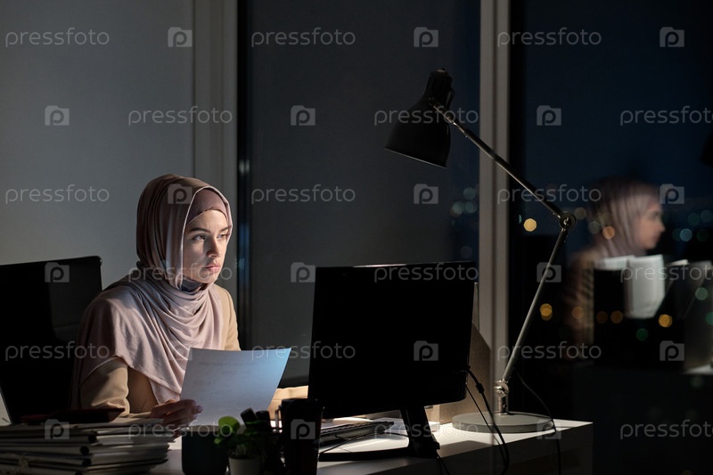 Молодая мусульманка в хиджабе держит бумагу и смотрит на компьютерный экран