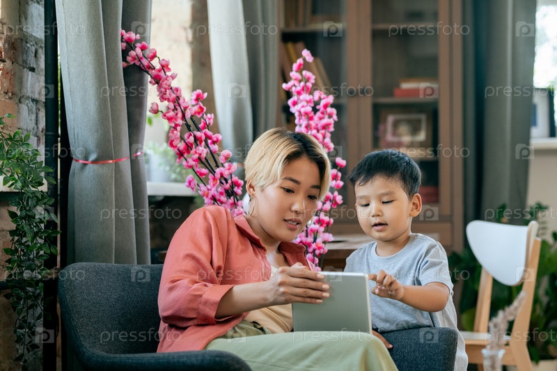 Молодая современная женщина показывает своего милого маленького сына онлайн мультфильм