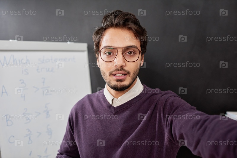 Портрет молодой бородатой школьной учительницы в круглых очках, позирующей на доске