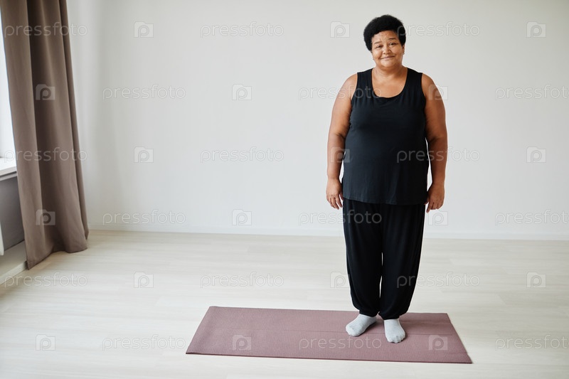 Афроамериканская женщина старшего возраста, стоящая на йога-матке