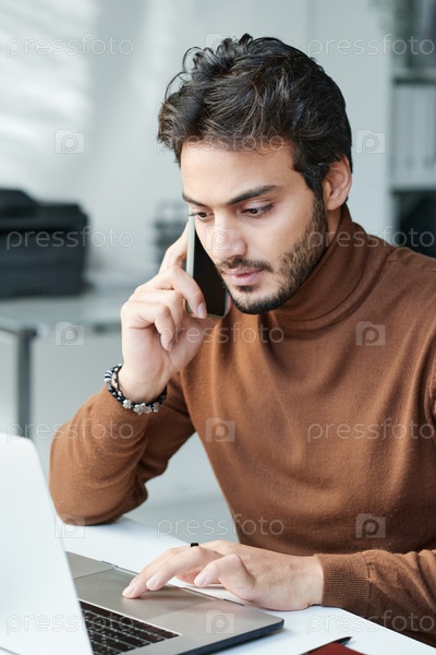 Серьезный современный бизнесмен в коричневом турнелеке, сидящий за столом и использующий ноутбук во время телефонного разговора