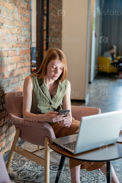 Молодая женщина прокручивает смартфон перед ноутбуком