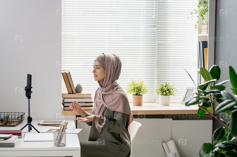 Молодая самоуверенная учительница в хиджабе смотрит на камеру смартфона