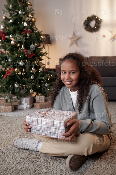 Милая веселая девушка африканской этнической принадлежности с коробкой подарков в руках