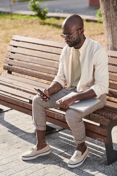 Молодой предприниматель работает через смартфон