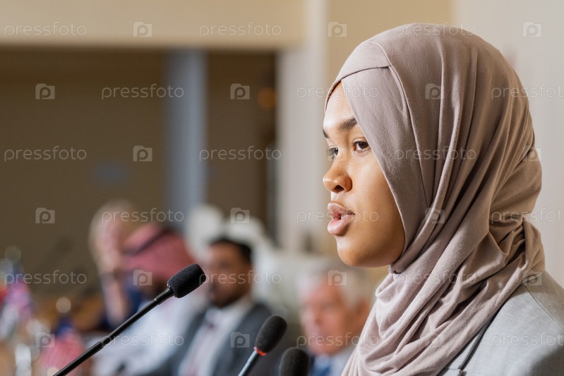 Молодая красивая ораторка в хиджабе, выступающая перед аудиторией на конференции