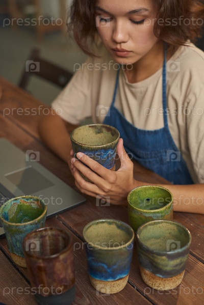Женщина, изучающая ручные кружки перед отправкой покупателю