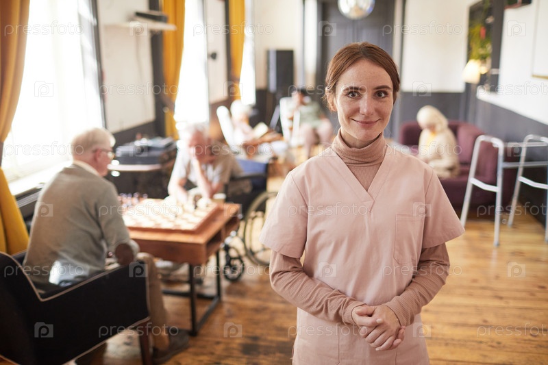 Улыбающаяся молодая медсестра в доме престарелых