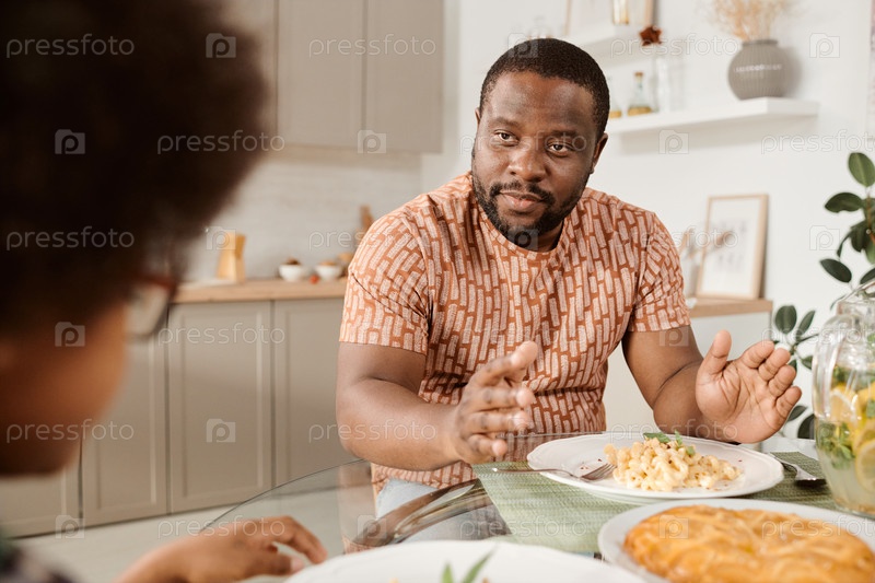Уверенный в себе молодой африканский мужчина разговаривает со своим маленьким сыном за ужином