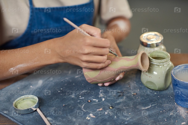 Рука молодой женщины, рисующей розовые полосы на ручной кружке