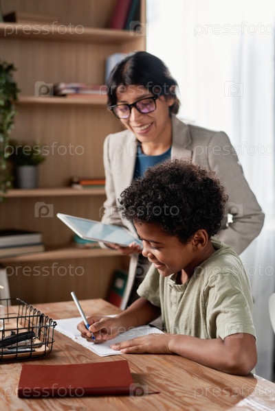 Латинский репетитор с планшетом стоит у афроамериканского школьника, который выполняет задание во время индивидуального урока