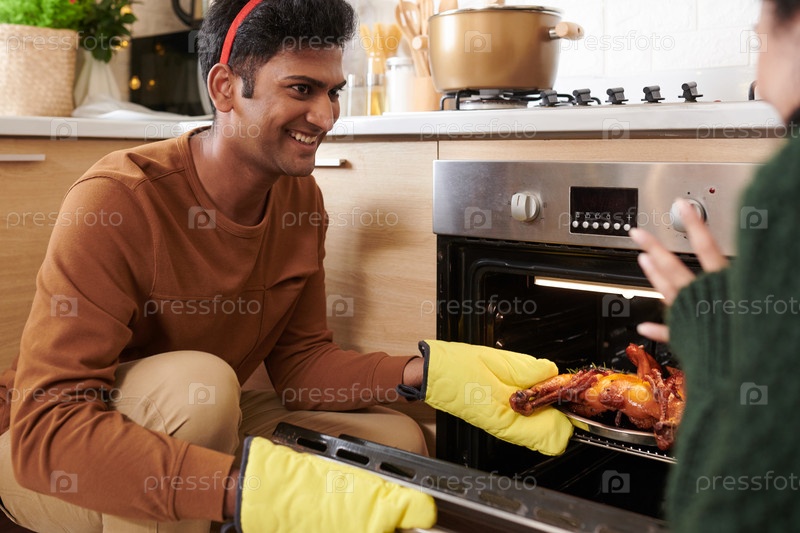 Человек, вынимающий индейку из печи