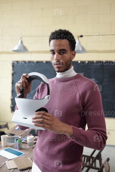 Молодой уверенный бизнесмен с VR-гарнитурой в руках, смотрящий на камеру