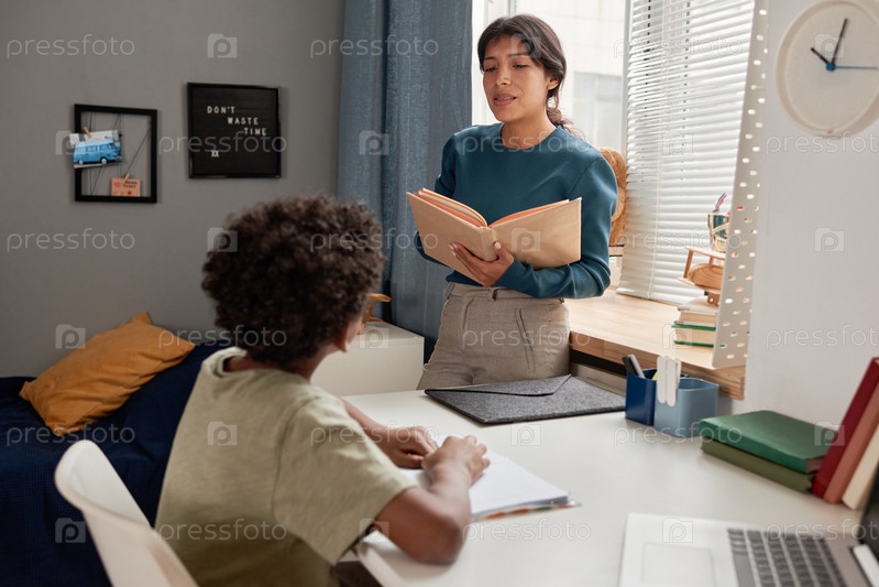 Молодая латиноамериканская репетиторка стоит у окна детской комнаты и задает вопросы чернокожему ученику во время урока один за одним