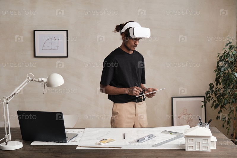 Загруженный архитектор в гарнитуре VR анализирует онлайн-эскиз