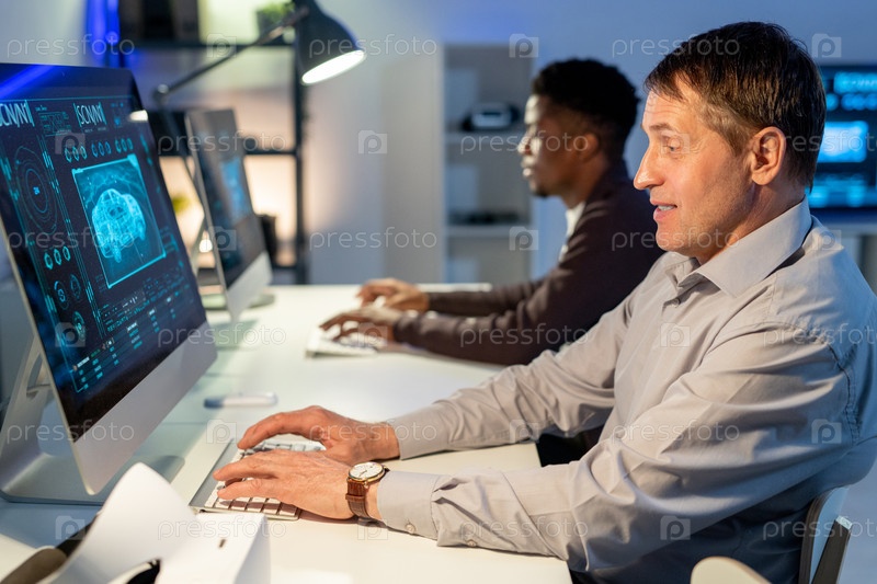 Зрелый мужчина разрабатывает автомобиль на компьютере