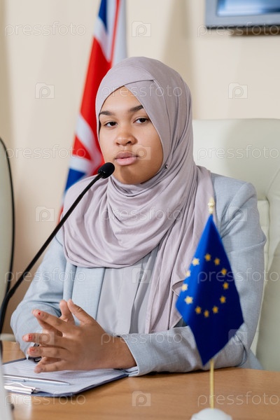 Молодая успешная женщина-политик в хиджабе делает отчет