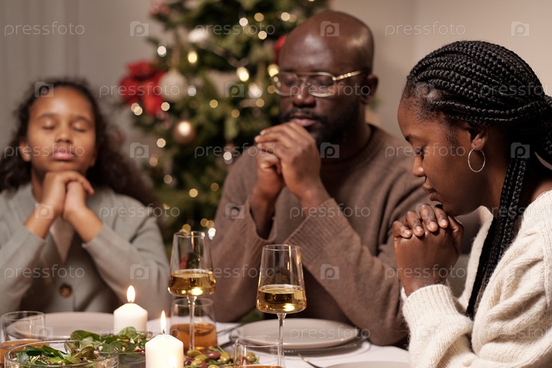 Молодая африканская женщина, ее муж и их милая дочь молятся перед ужином