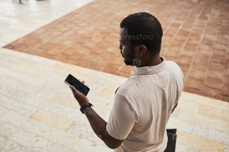 Черный мужчина держит смартфон в городе