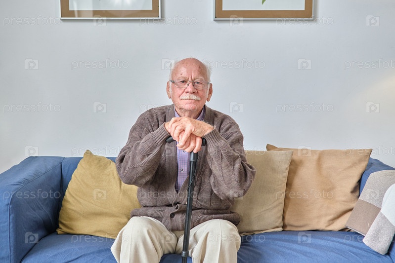 Пожилой мужчина сидит на диване и отдыхает