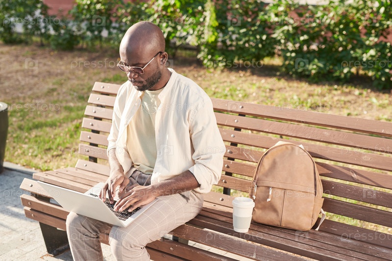 Загруженный мужчина, использующий ноутбук на открытом воздухе