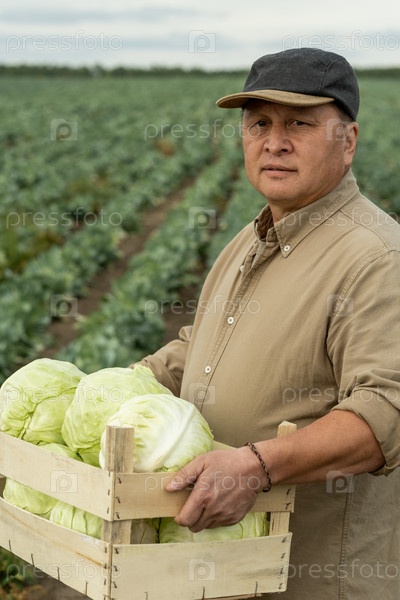 Азиатский рабочий на плантации капусты