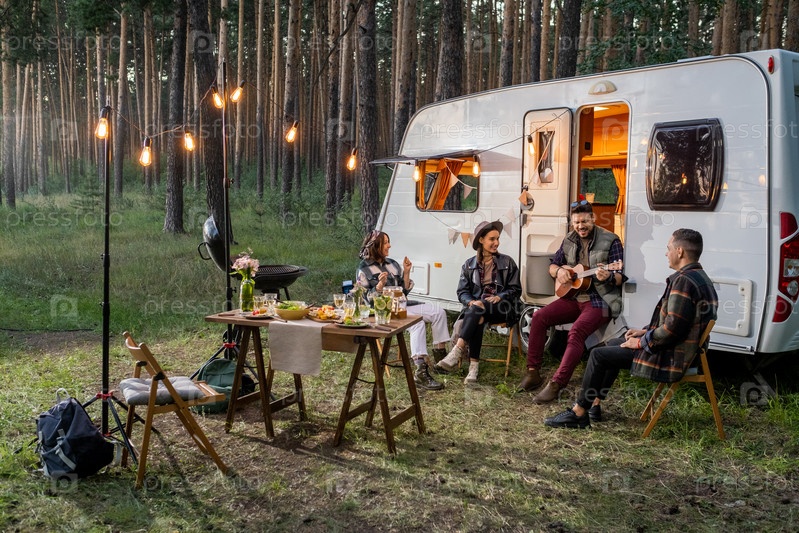 Молодой человек играет на гитаре и поёт со своими друзьями