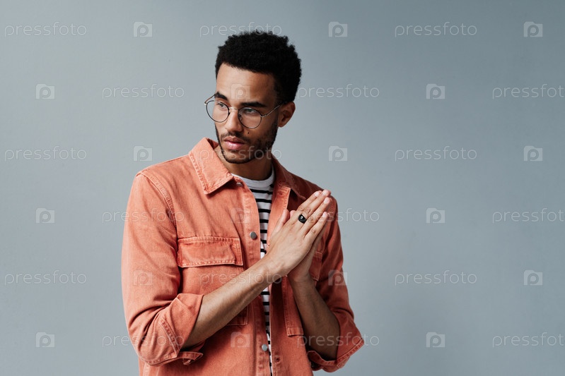 Вдумчивый молодой мужчина смешанной расы в обычной рубашке и очках, стоящий на серой стене и протирающий руки