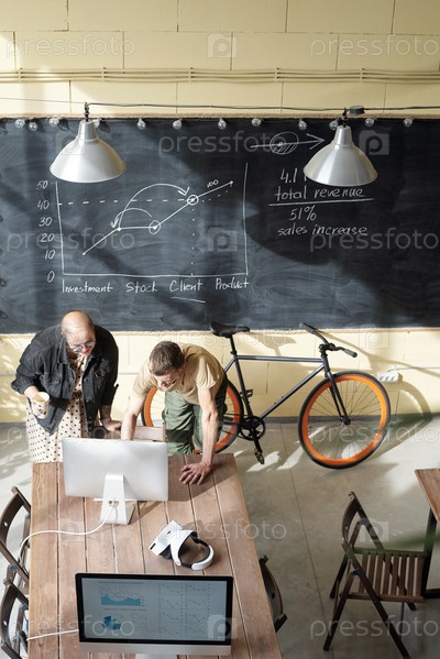 Два молодых экономиста, склонившиеся над столом с компьютерным монитором