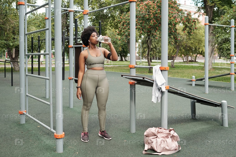 Молодая спортсменка стоит на спортивной площадке и пьет воду
