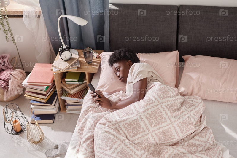 Женщина отдыхает с телефоном в спальне