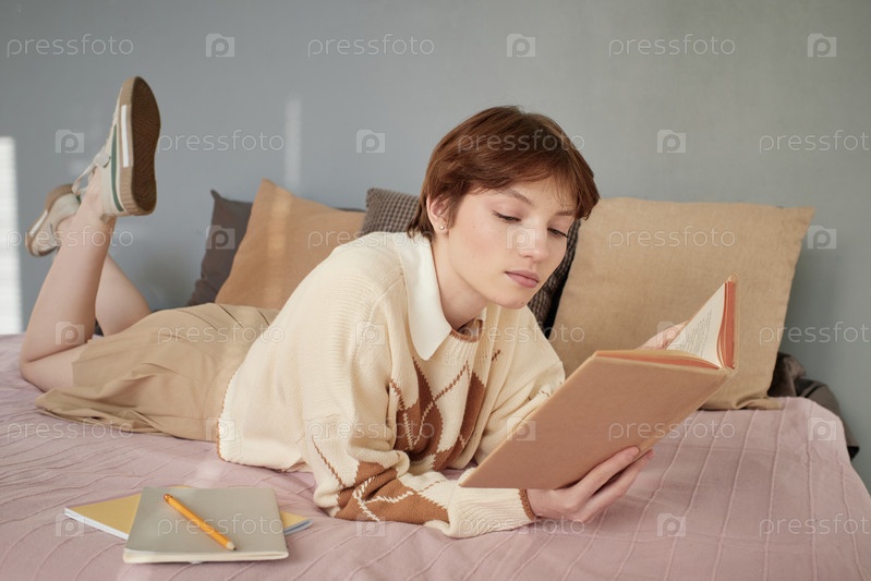 Серьезная девушка с короткими волосами в студенческой форме, лежащая на кровати и читающая учебник во время подготовки к занятиям