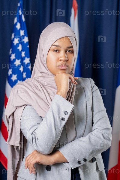 Молодая серьезная женщина в хиджабе и формальной одежде смотрит на тебя