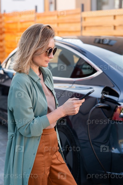 Женщина со смартфоном ждет окончания процесса зарядки автомобиля