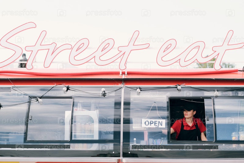 Молодая женщина вешает объявление об открытии на окне пищевого грузовика
