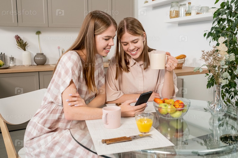 Красивые сестры-близнецы обсуждают видео на смартфоне