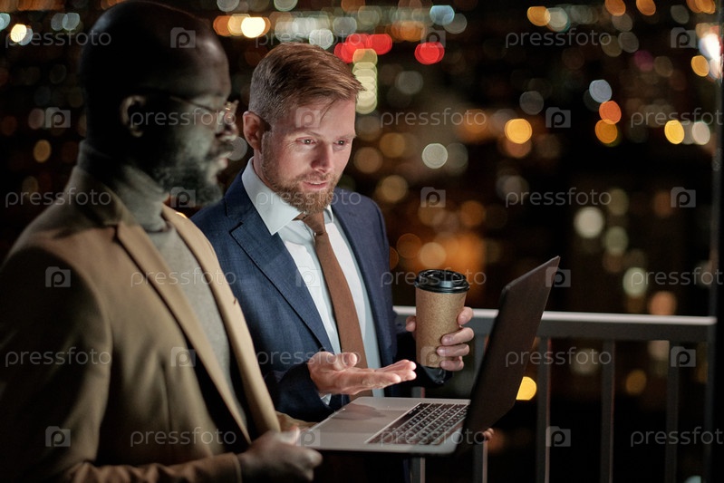 Один из двух деловых партнеров, объясняющих смысл презентации