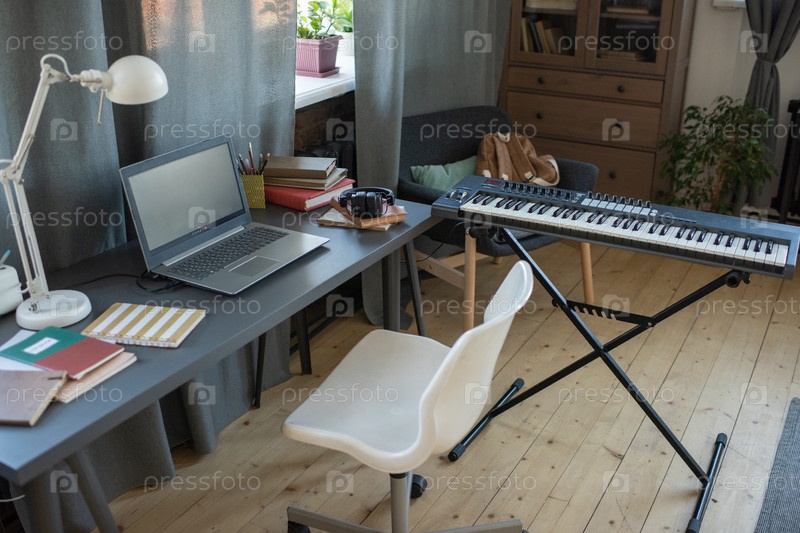 Клавиатура фортепиано, стол с ноутбуком и кресло в гостиной