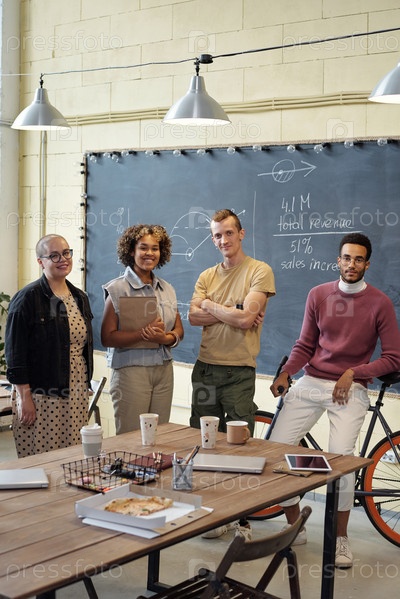 Счастливые молодые экономисты, стоящие за столом в большом открытом офисе