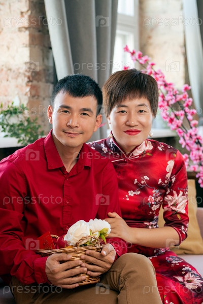 Счастливая молодая азиатская пара в умной повседневной одежде