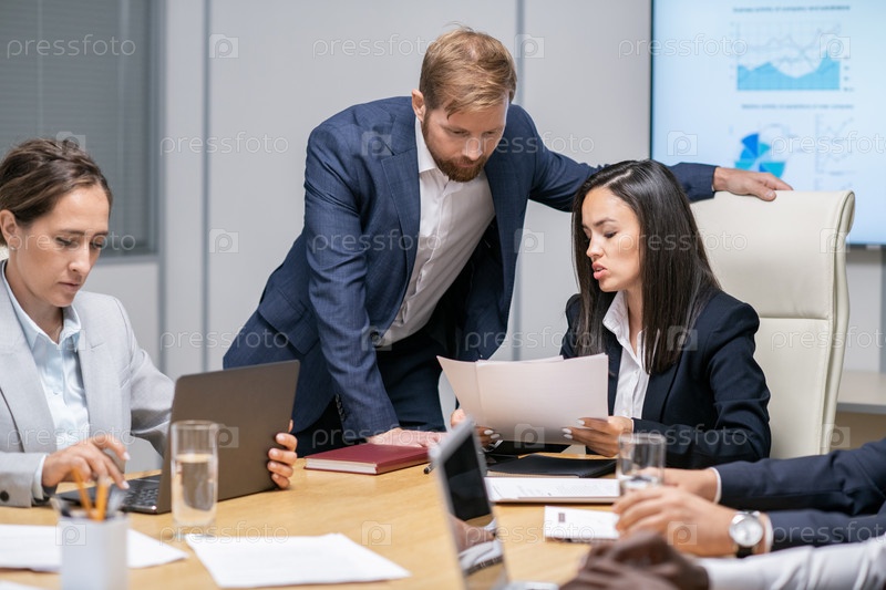 Молодая бизнесвуменка показывает финансовые документы своему коллеге-мужчине