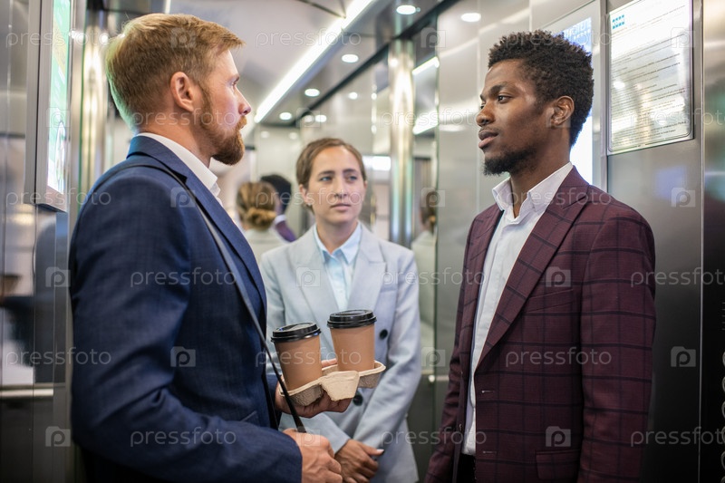 Два межкультурных бизнесмена и молодая деловая женщина в лифте
