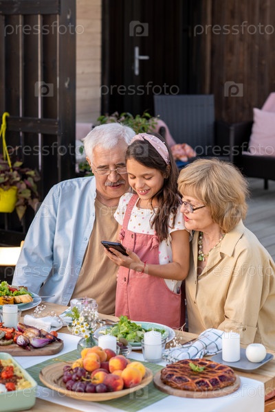 Девушка показывает новое приложение бабушке и дедушке