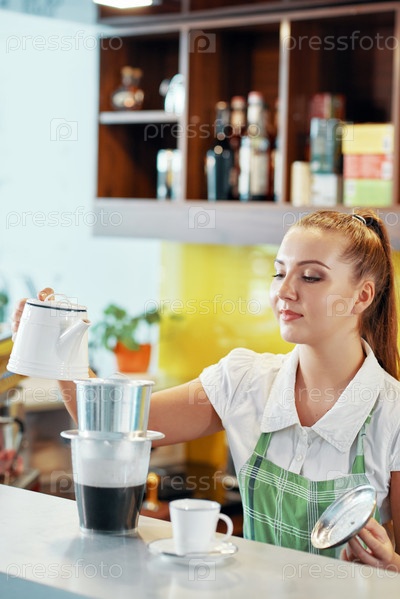Женщина-бариста делает кофе