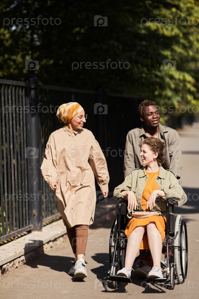 Толкание женщины-инвалида в инвалидном кресле во время прогулки