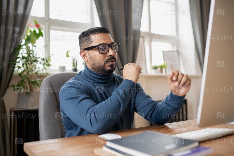 Современный учитель сидит на рабочем месте перед монитором компьютера