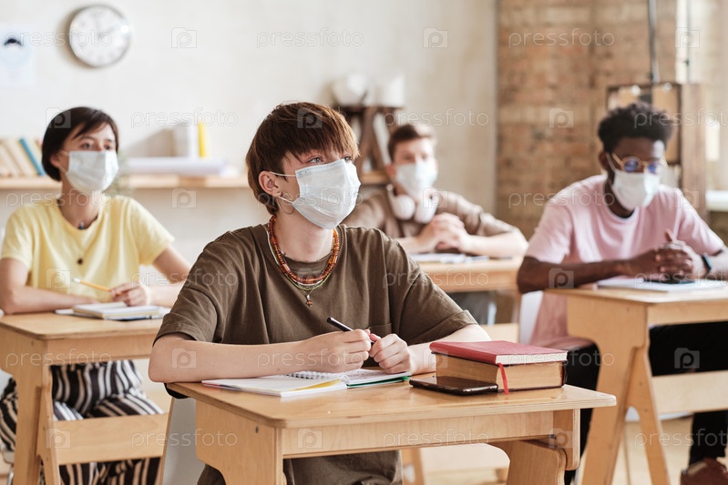Студенты в масках учатся в школе