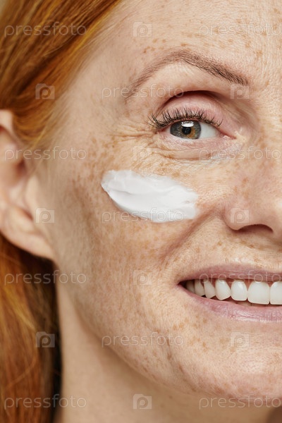 Улыбающаяся женщина с помощью крема для лица
