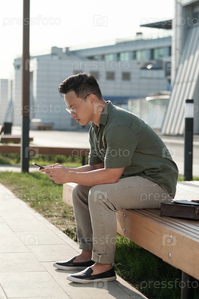 Молодой азиатский бизнесмен со смартфоном сидит на скамейке